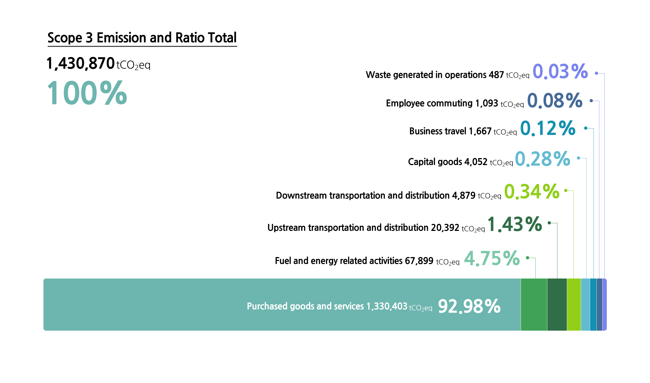 Scope 3 Emission ControlExpanding the scope of Net Zero to supply chain, SKC has disclosed and controlled Scope 3 emission data verified by a 3rd party since 2023. Scope 3 covers greenhouse gases emitted indirectly not only in production of products but also the entire product lifecycle from raw material purchase to product use and scraping, rendering it difficult for SKC to reduce it single-handedly. Accordingly, SKC has selected critical control points out of 15 categories defined in Scope 3 in line with the characteristics of respective businesses, planning to develop a phase-wise reduction strategy in cooperation with key upstream and downstream stakeholders.