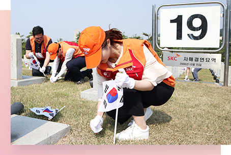 In sisterhood relationship with Seoul National Cemetery, SKC has provided volunteer services such as tombstone cleaning, flower changing and sticking national flag since 2008. SKC employees have provided volunteer services on Memorial Day and engea Armed Forces Day every year, paying tribute to the martyrs and the spirits of the fallen patriots.