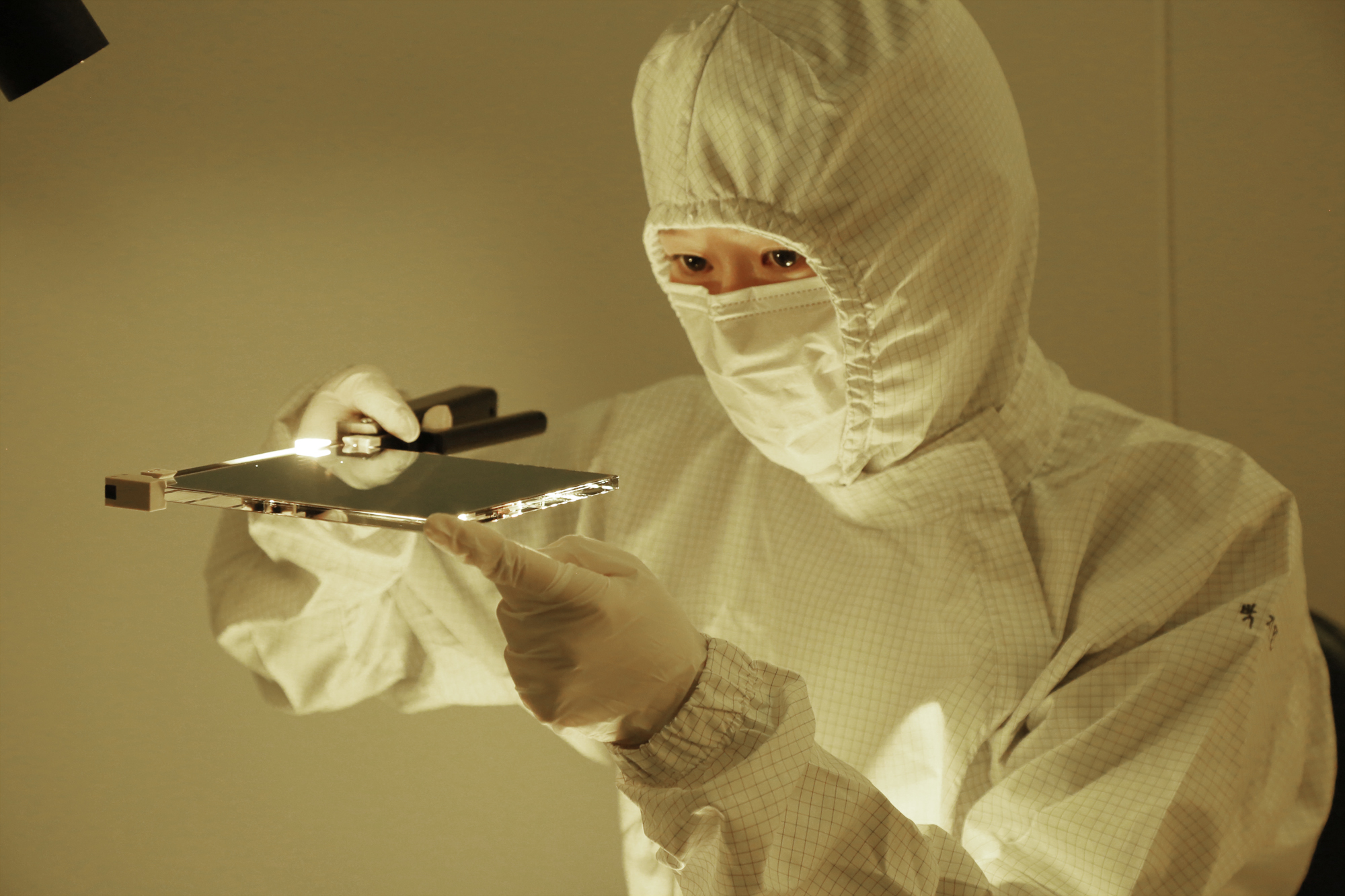 [SKC 구성원이 반도체 노광공정 핵심소재인 블랭크 마스크의 시제품을 검사하고 있다. ]