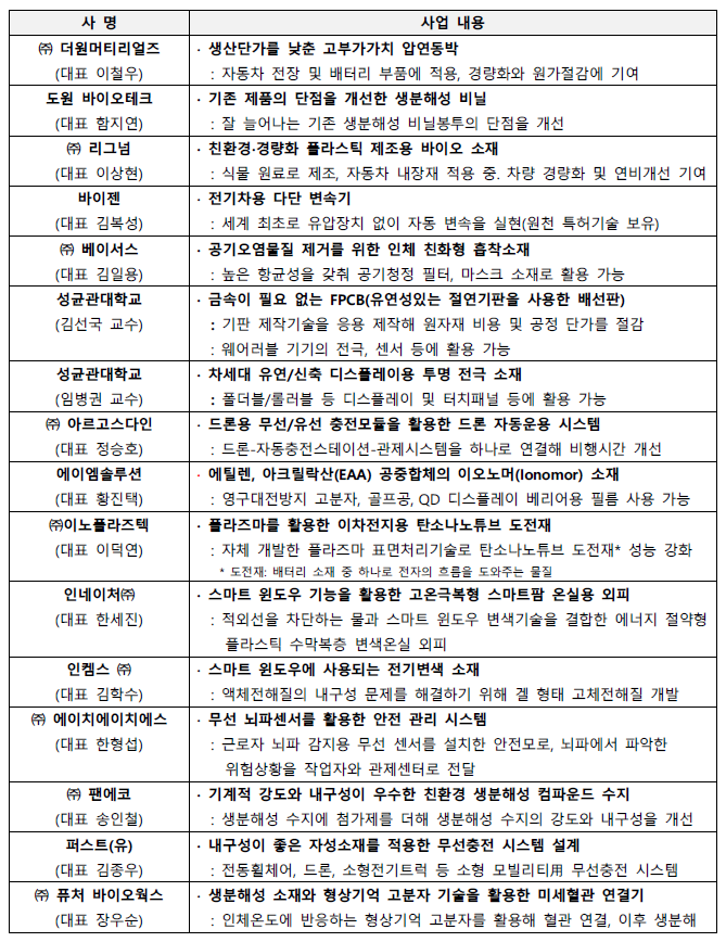※ 선발기업 16곳 : ▲더원머티리얼즈(대표 이철우) ▲도원바이오테크(대표 함지연) ▲리그넘(대표 이상현) ▲바이젠(대표 김복성) ▲베이서스(대표 김일용) ▲아르고스다인(대표 정승호) ▲에이엠솔루션(대표 황진택) ▲㈜이노플라즈텍(대표 이덕연) ▲인네이처(대표 한세진) ▲인켐스(대표 김학수) ▲에이치에이치에스(대표 한형섭) ▲팬에코(대표 송인철) ▲퍼스트(유)(대표 김종우) ▲퓨처바이오웍스(대표 장우순) ▲성균관대학교 김선국 교수(예비창업자), ▲성균관대학교 임병권 교수(예비창업자)