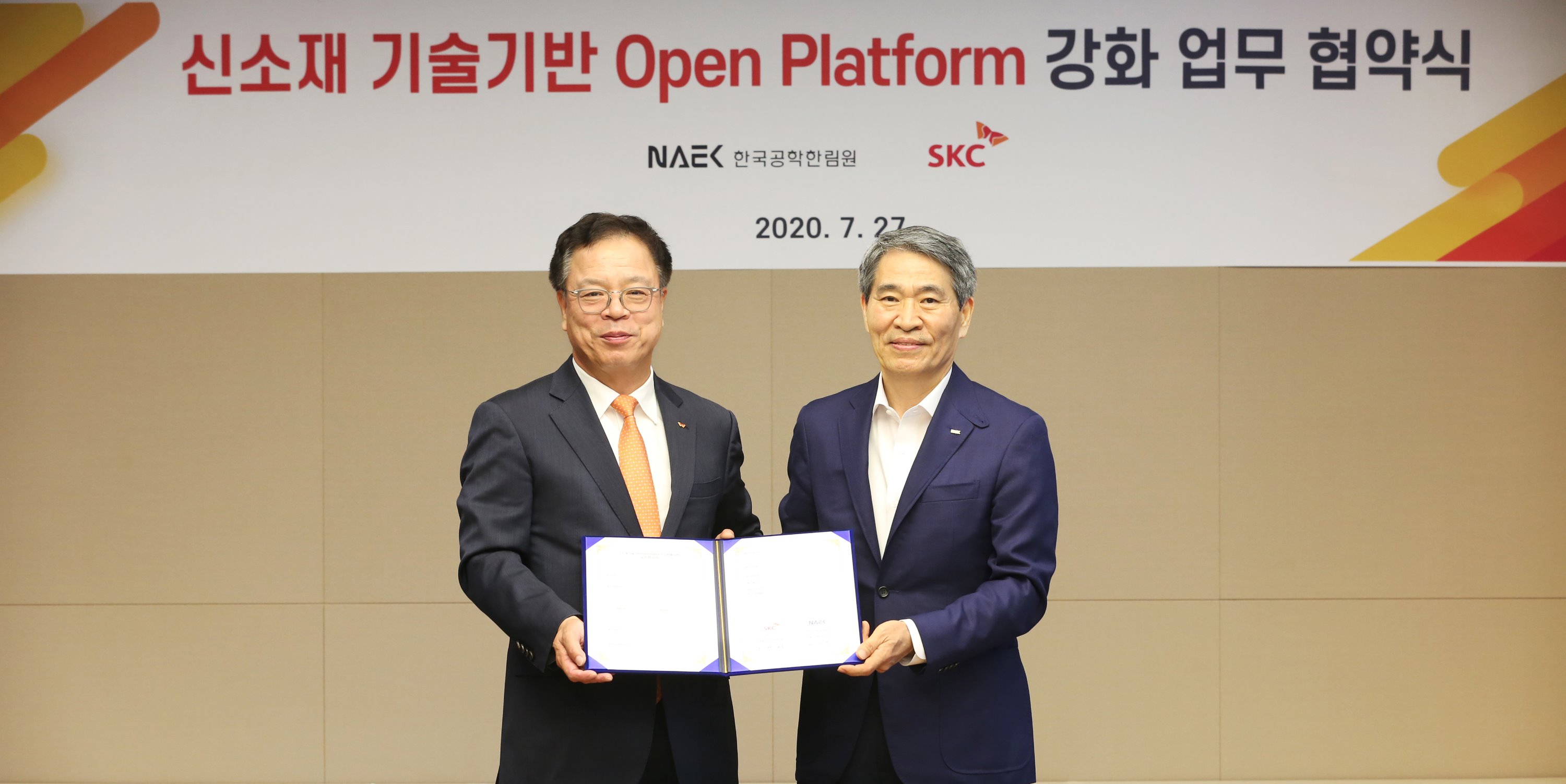 SKC 이완재 사장은 27일 권오경 한국공학한림원 회장, 박동건 상임부회장, 나경환 기술경영정책분과위원장과 함께 ‘신소재 기술기반 오픈 플랫폼 강화를 위한 업무협약(MOU)’을 체결했다. 국내 최고 수준의 역량을 가진 공학한림원 회원이 직접 ‘신소재 기술기반 오픈 플랫폼’(오픈플랫폼) 참여기업에 경영, 공장 운영, 연구개발 등 분야의 구체적이고 전문적인 컨설팅을 제공한다는 내용이다. 공학한림원은 투자 유치도 지원하고 기술∙경영에 대한 전문 세미나를 실시한다.