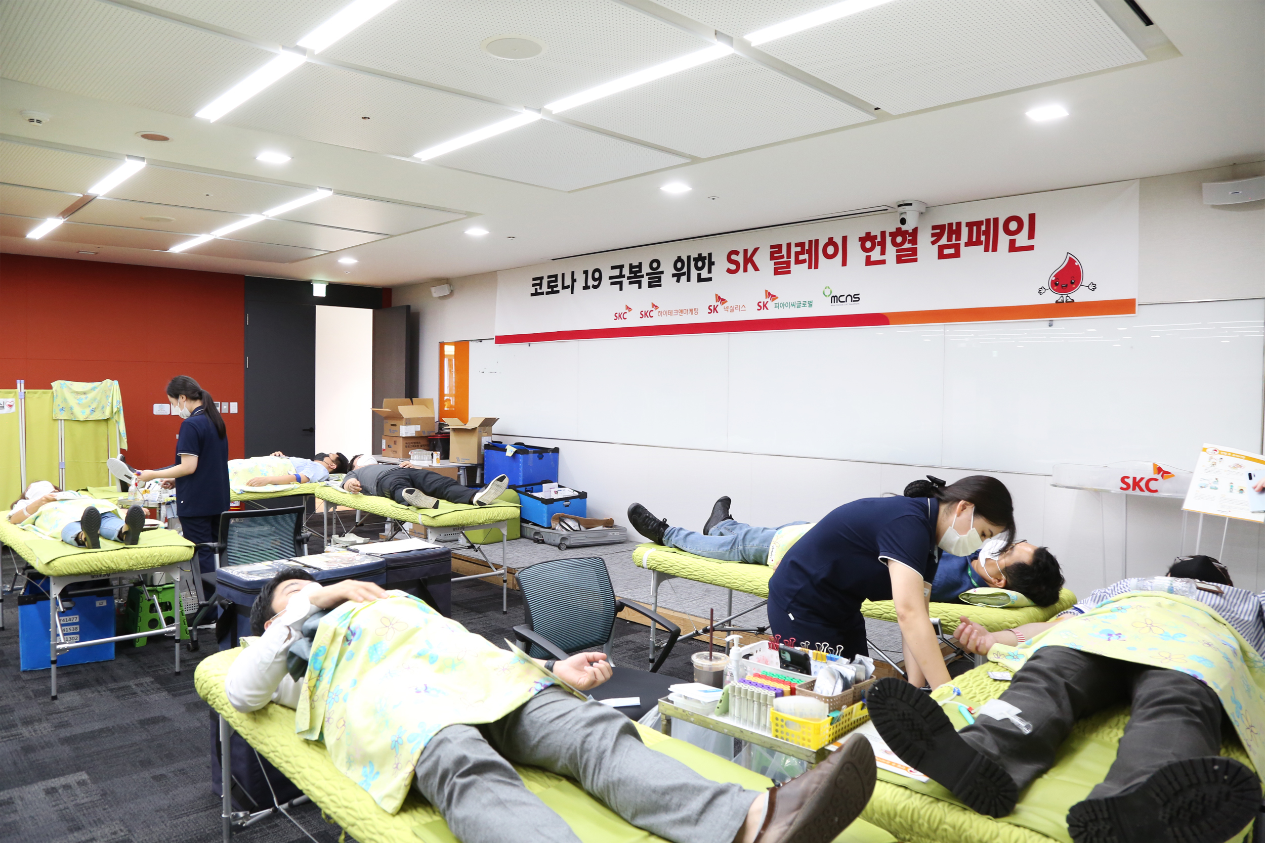 대한적십자사 서울동부혈액원이 서울 종로구 SKC 본사 6층 교육장에 헌혈 공간을 마련했고, 헌혈 참여자는 SK텔레콤이 개발한 세계 최초 헌혈자 건강관리 앱 ‘레드 커넥트’와 혈액관리본부 홈페이지 등을 통해 전자 문진을 한 뒤, 헌혈에 참여했다.