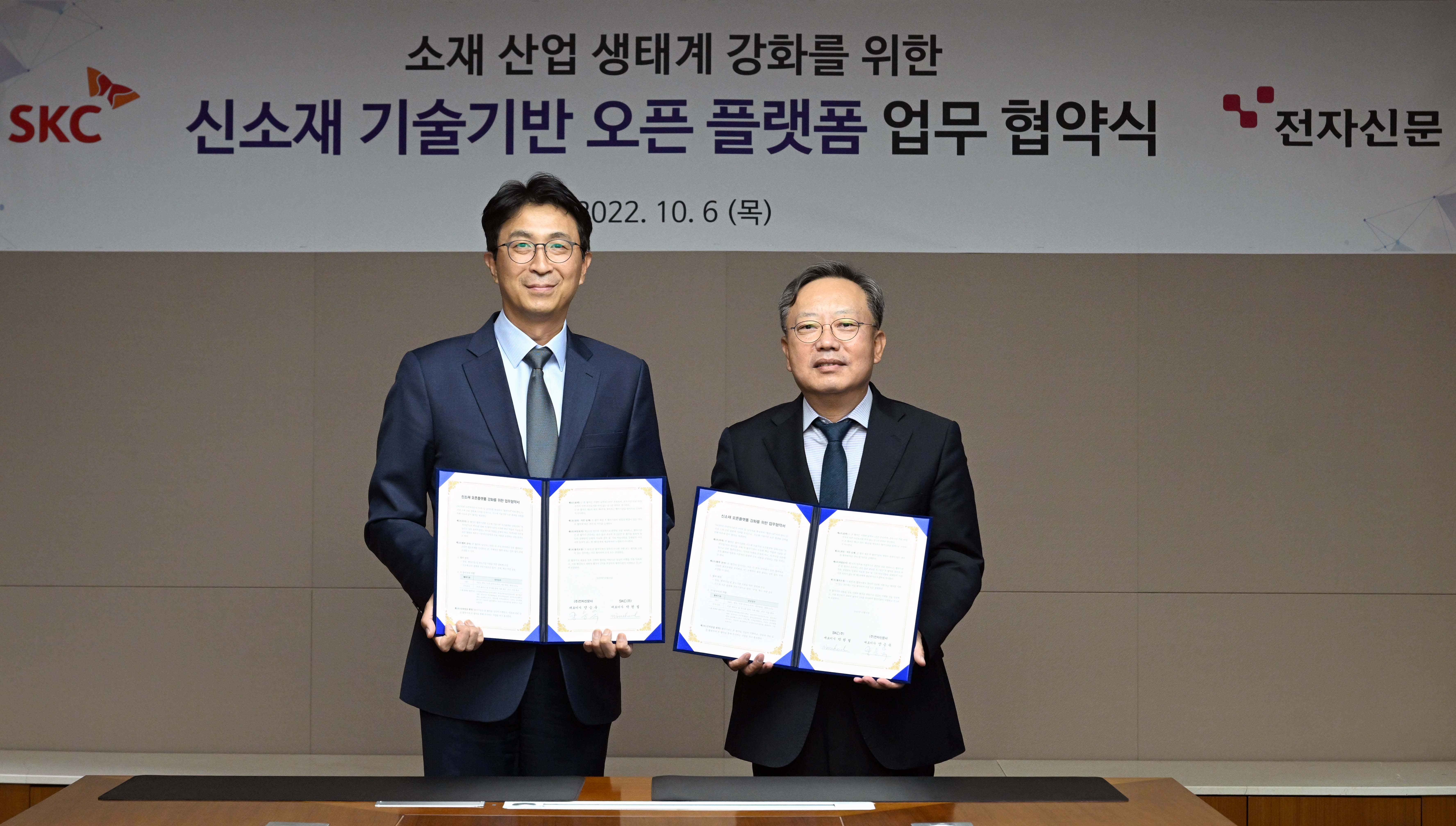 SKC와 전자신문사는 6일 서울 종로구 SKC 본사에서 ‘신소재 기술기반 오픈플랫폼 강화를 위한 업무협약’을 체결했다. 양사는 이번 협약을 통해 우수한 소재 기술을 가진 스타트업과 중소기업을 지원해 국내 소재 산업 생태계를 강화하는 데 함께 기여해 나가기로 했다. 이날 협약식에는 박원철 SKC 사장, 양승욱 전자신문 사장 겸 발행·인쇄·편집인 등 각 사 주요 경영진이 참석했다.