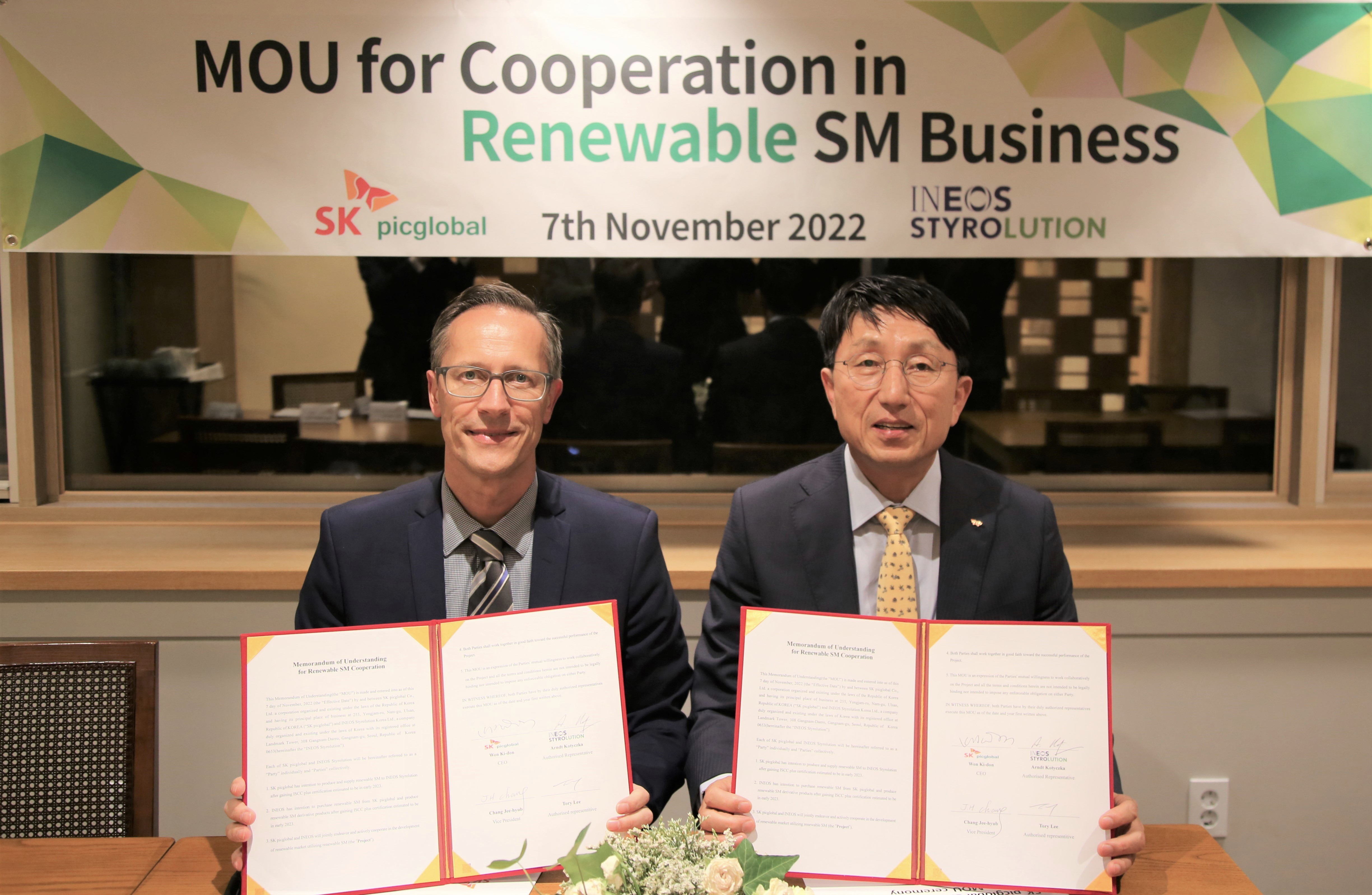 [SK피아이씨글로벌은 7일 이네오스스티롤루션과 재생 가능한 친환경 스티렌모노머(SM) 사업을 공동 추진하는 내용의 협약을 맺었다. 원기돈 SK피아이씨글로벌 대표(오른쪽)와 아른트 코티츠카 이네오스스티솔루션 부사장이 협약서를 들어보이고 있다.]