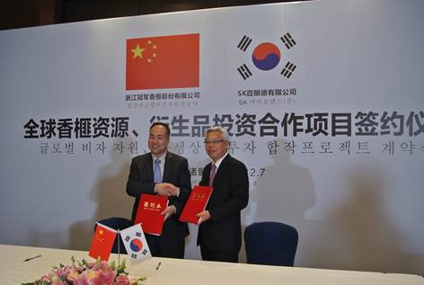 SK바이오랜드(대표 정찬복)는 7일 중국 저장성(浙江省) 주지시(諸暨市)에서 절강관군향비주식유한회사(대표 루오 꽌쥔, 이하 ‘관군집단’) 와 합작사 설립을 위한 계약을 체결했다고 밝혔다. 신설되는 합작회사는 자본금이 1억위안(약 170억원)으로 양사가 현물 또는 기술 출자를 통해 설립되며, SK바이오랜드가 40%, 관군집단이 60%의 지분을 갖는 구조로 공동경영체계로 운영되며, 저장성 주지시에 위치할 예정이다.