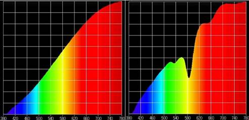 <스펙트럼 광도계로 살펴본, 네오스카이 적용 전(왼쪽)과 적용 후(오른쪽) 모습.