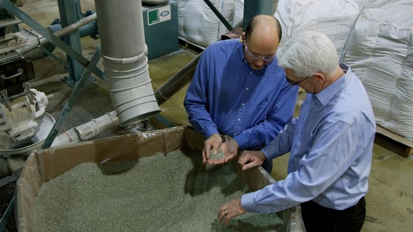 <톰 그레이 SKC inc. 신사업 및 마케팅 총괄(사진 오른쪽)이 테스트를 진행한 미국 재활용업체 대표와 함께 재활용 PET칩을 살펴보고 있다.>