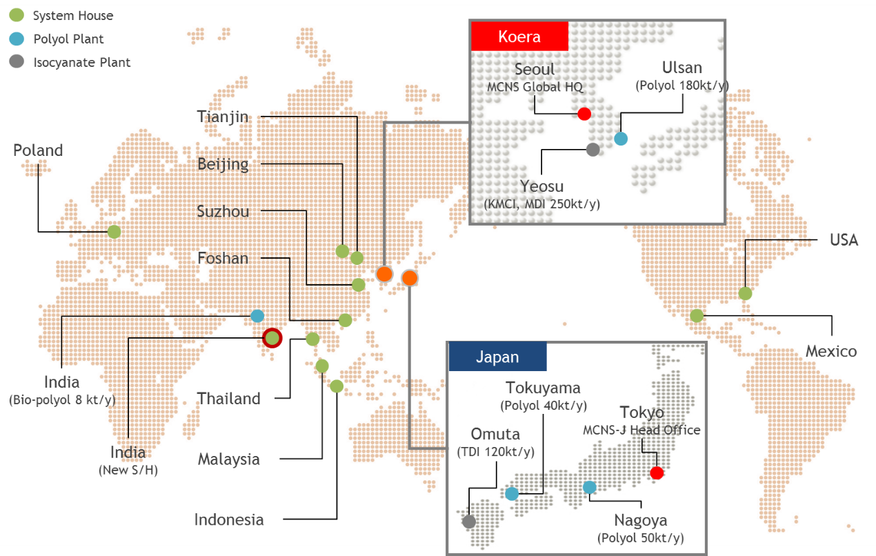 MCNS는 2015년 7월 SKC와 미쓰이화학이 각각 운영하던 폴리우레탄 사업을 분할하여 50:50 합작해 만든 회사다. 전세계 10개국에서 17개 생산기지를 운영하고 있으며 연간 생산량은 75만 톤, 연간 매출은 1.2조원 가량이다. [끝]
