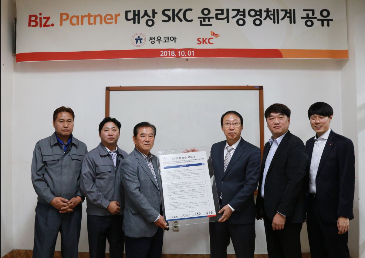 SKC는 협력사에 윤리경영체계 등 무형자산을 공유하는 노력을 더욱 확대한다. 올해 청우코아를 비롯해 총 3곳에서 윤리경영체계를 공유하고, 내년에는 회사의 자산을 보호하는 정보 보안 교육까지 확대하는 방안을 검토한다.